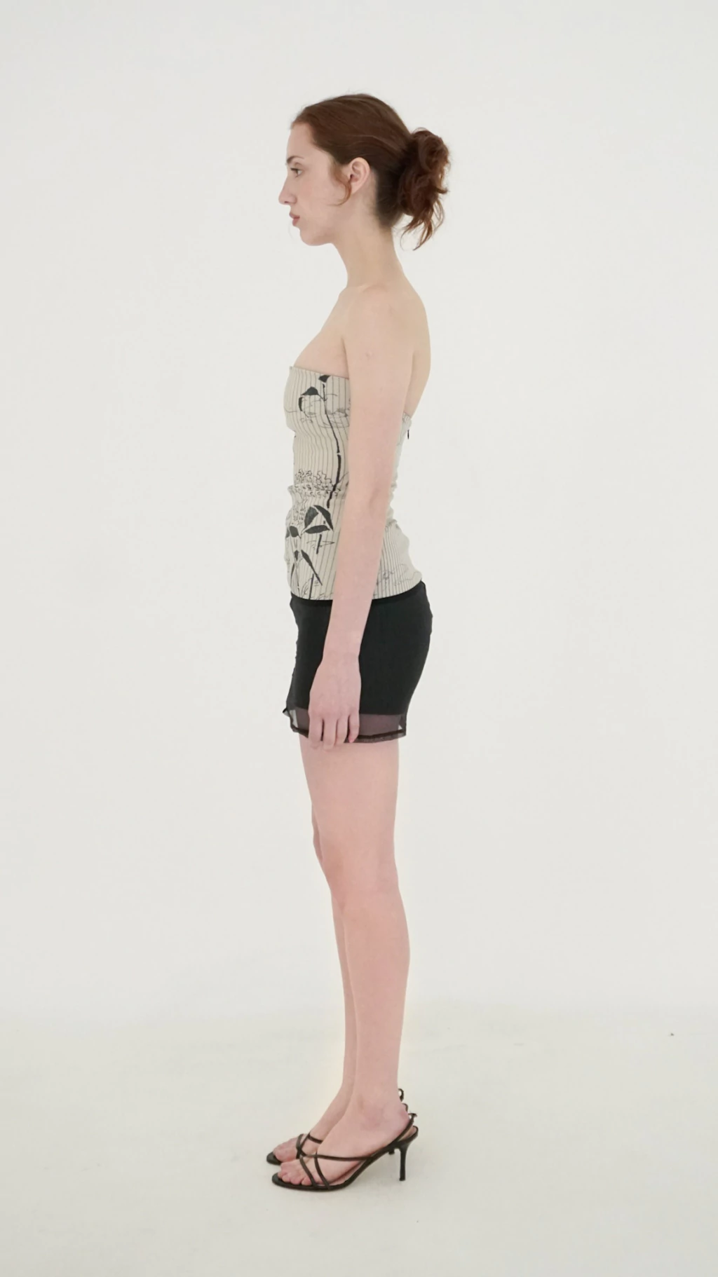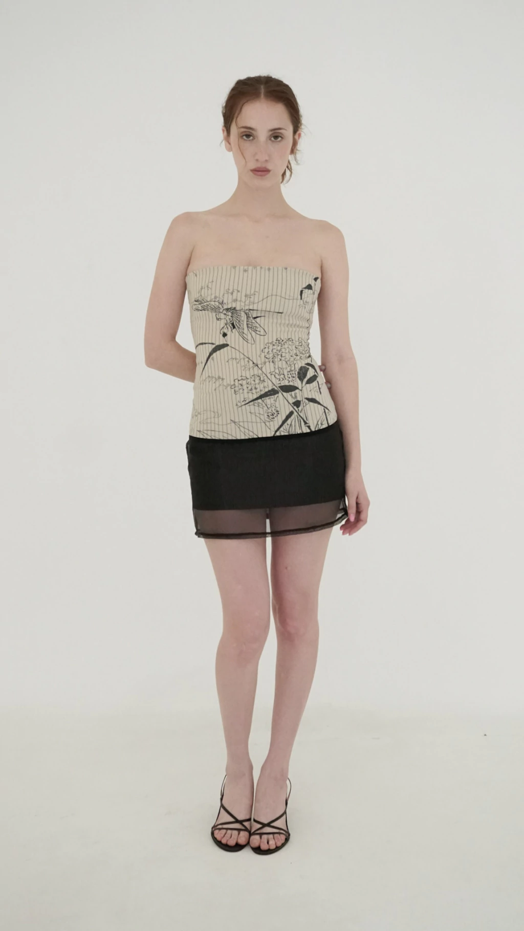 Top strapless estampado con terminación en cinta biés color negro. Acceso a través de cierre invisible en espalda. Textil bengalina elastizada. La estampa fue armada en base a una obra de Miyazaki Yūzen.